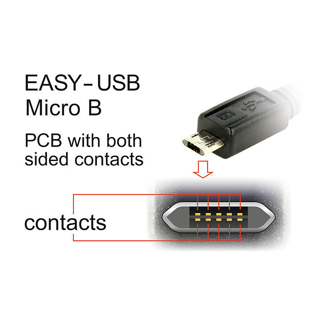 "DeLOCK 83845. Cable length: 0.5 m. Connector 1: USB A, Connector 2: Micro-USB B, USB version: USB 2.0, Connector contacts plating: Gold, Product colour: Black"\n"This cable by Delock with EASY-USB Type-A male and EASY-USB Type Micro-B male can be plugged into the appropriated USB female port in both directions. Thus the male connector can be used both-sided which makes the plug in easier."