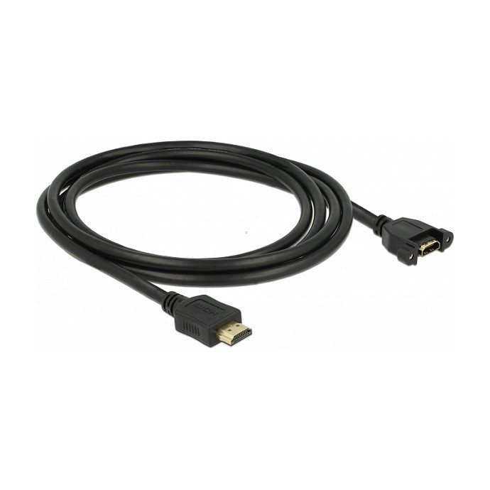 "DeLOCK 85464. Cable length: 2 m, Connector 1: HDMI Type A (Standard), Connector 1 gender: Male, Connector 2: HDMI Type A (Standard), Connector 2 gender: Female, Connector contacts plating: Gold, Maximum resolution: 3840 x 2160 pixels, Data transfer rate: 10.2 Gbit/s, Product colour: Black"\n"This cable by Delock can be used to extend an HDMI connection and to connect various devices. The female port can be attached with two screws, e.g. to a slot bracket, a cable duct or an enclosure with the corresponding opening. In this way, it is possible to install a HDMI connector in an easily accessible position."