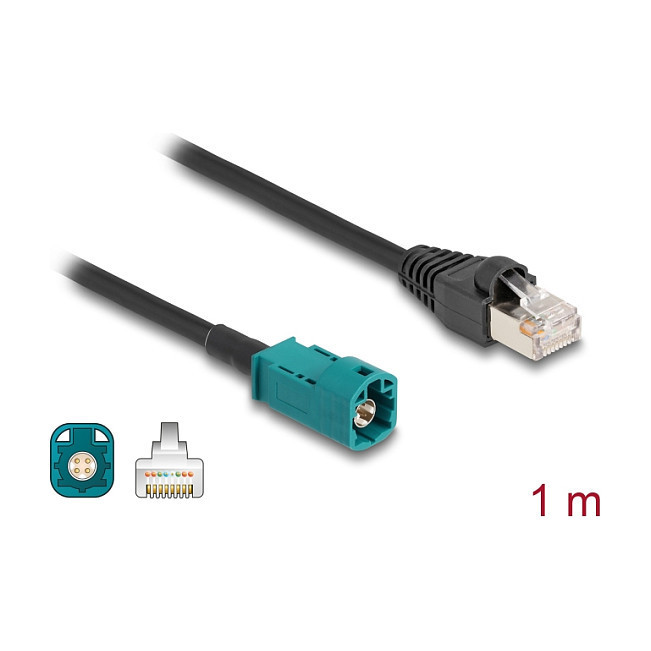 "DeLOCK 90698. Cable length: 1 m, Connector 1: HSD Z, Connector 2: RJ-45. Quantity per pack: 1 pc(s). Package type: Polybag. Country of origin: China"\n"This cable by Delock is suitable for connecting components of electronic technology and electronic in vehicles."