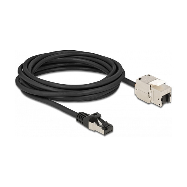 "DeLOCK Cable RJ45 plug to Keystone Module RJ45 jack Cat.6A 5 m black. Construction type: Flat, Product colour: Black, Connector 1: RJ-45. Quantity per pack: 1 pc(s)"\n"This network cable by Delock can be used to extend and connect various devices. The Keystone module can be used for mounting in various holders, such as keystone patch panels, face plates or surface-mount boxes."