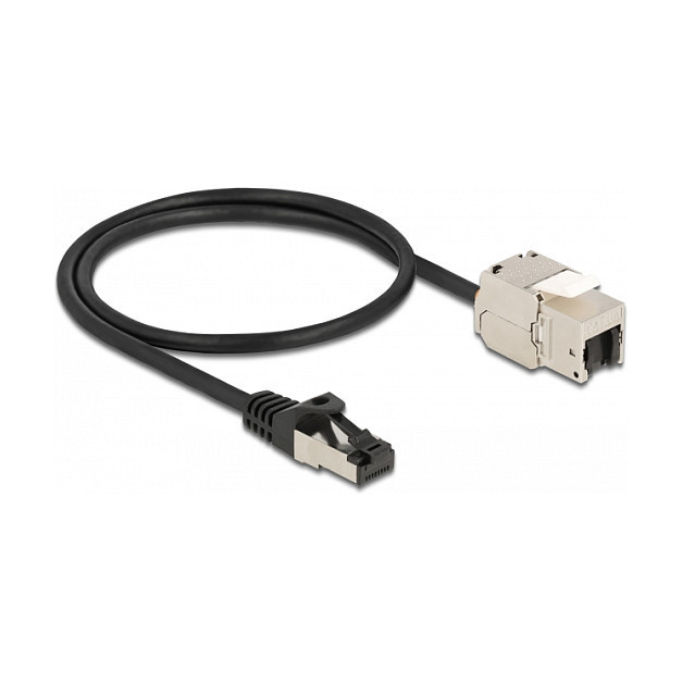 "DeLOCK Cable RJ45 plug to Keystone Module RJ45 jack Cat.6A 50 cm black. Construction type: Flat, Product colour: Black, Connector 1: RJ-45. Quantity per pack: 1 pc(s)"\n"This network cable by Delock can be used to extend and connect various devices. The Keystone module can be used for mounting in various holders, such as keystone patch panels, face plates or surface-mount boxes."
