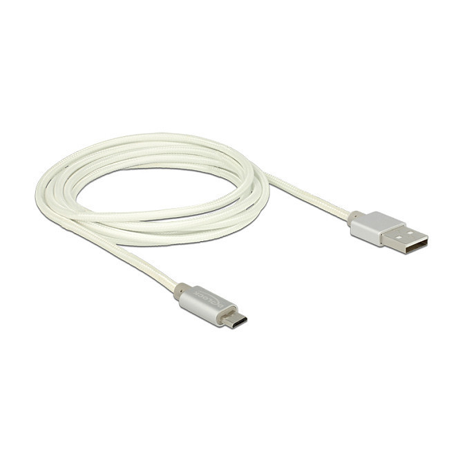 "DeLOCK 2m, USB2.0-A/USB2.0 Micro-B. Cable length: 2 m. Connector 1: USB A, Connector 2: Micro-USB B, USB version: USB 2.0, Connector gender: Male/Male, Maximum data transfer rate: 0.48 Gbit/s, Product colour: Silver, White"\n"This Delock USB data- and charging cable can be connected to a standard USB A interface. Thus you can quickly and easily charge your mobile phone with a micro USB interface and also transfer data. Optically it convinces with its fine textile shielding and connector with solid metal housing."