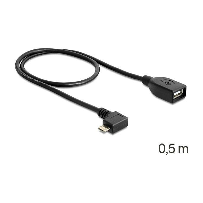 "DeLOCK USB micro-B - USB 2.0-A, 0.5m. Cable length: 0.5 m. Connector 1: Micro-USB B, Connector 2: USB A, USB version: USB 2.0, Connector gender: Male/Female, Maximum data transfer rate: 0.48 Gbit/s, Product colour: Black"\n"This USB micro cable by Delock enables you to convert the USB micro-B port of your mobile device into a USB-A female port. Thus you can connect e.g. HDDs, memory sticks with standard USB port to mobile phones, smart phones, tablet PCs etc. with OTG support. The OTG function enables a direct data transfer between your mobile device and the USB device, without connection to a computer."