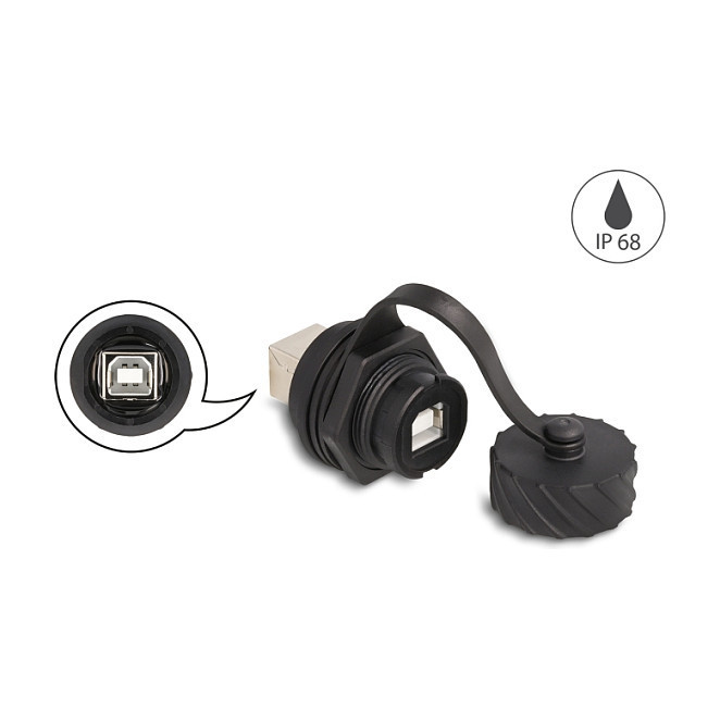 "DeLOCK Cable Connector USB 2.0 Type-B female to female for installation with bayonet protective cap IP68 dust- and waterproof black. Connector 1: USB 2.0 Type-B, Connector 2: USB 2.0 Type-B. Product colour: Black"\n"This cable connector by Delock can be used to connect or extend two USB Type-B cables and is ideal for housing or on a panel.