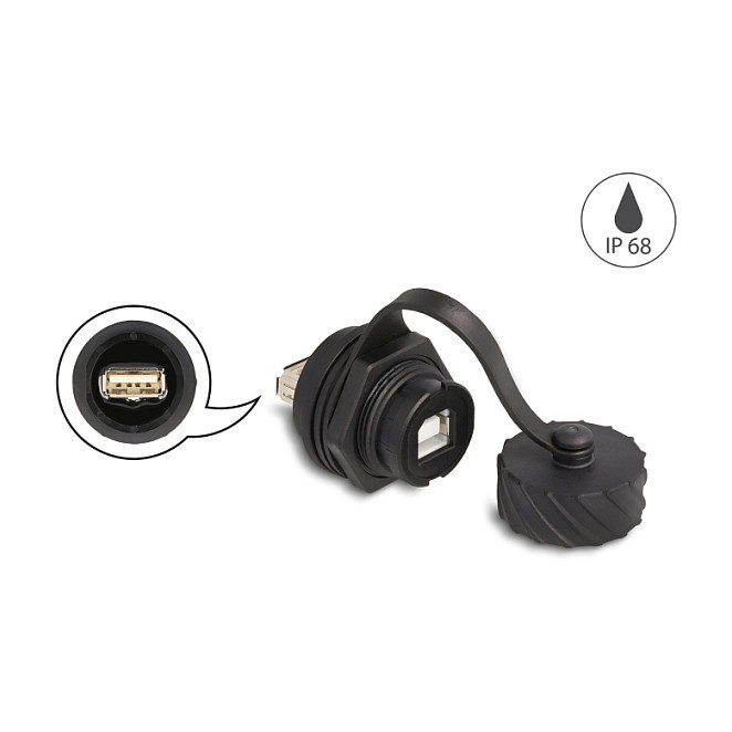 "DeLOCK Cable Connector USB 2.0 Type-B female to USB 2.0 Type-A female for installation with bayonet protective cap IP68 dust- and waterproof black. Connector 1: USB 2.0 Type-B, Connector 2: USB 2.0 Type-A. Product colour: Black"\n"This cable connector by Delock can be used to connect or extend two USB cables and is ideal for housing or on a panel.