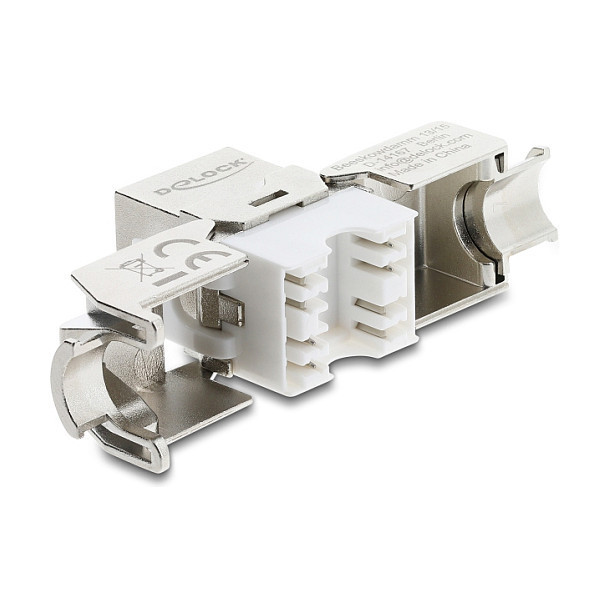 "DeLOCK Keystone Module RJ45 jack to LSA Cat.8.1 shielded tool-free. Construction type: Flat, Product colour: Silver, White, Connector 1: RJ-45. Width: 16.2 mm, Depth: 38.5 mm, Height: 19.6 mm. Package type: Polybag. Quantity per pack: 1 pc(s). Country of origin: China"\n"This module by Delock can be used to connect a network cable and is suitable for easy snap-in mounting in various holders, such as keystone patch panels, face plates or surface-mount boxes."