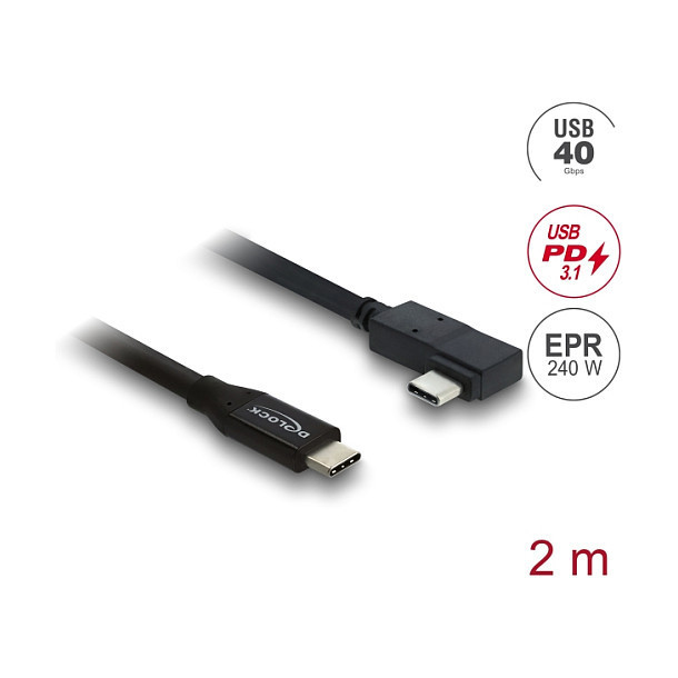 "DeLOCK Coaxial USB 40 Gbps cable angled left / right USB PD 3.1 240 W 2 m. Cable length: 2 m. Connector 1: USB C, Connector 2: USB C, USB version: USB4 Gen 3x2, Maximum data transfer rate: 40 Gbit/s, Connector contacts plating: Gold, Product colour: Black"\n"This USB cable by Delock enables the connection of various devices, such as smart phones, monitors, external enclosures and docking stations, via a USB Type-C™ or Thunderbolt™ 3 port of a PC or laptop. The cable supports the transfer of USB as well as DisplayPort and PCI Express data.