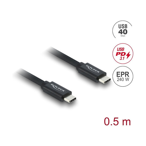 "DeLOCK Coaxial USB 40 Gbps cable USB PD 3.1 240 W 0.5 m. Cable length: 0.5 m. Connector 1: USB C, Connector 2: USB C, USB version: USB4 Gen 3x2, Maximum data transfer rate: 40 Gbit/s, Connector contacts plating: Gold, Product colour: Black"\n"This USB cable by Delock enables the connection of various devices, such as smart phones, monitors, external enclosures and docking stations, via a USB Type-C™ or Thunderbolt™ 3 port of a PC or laptop. The cable supports the transfer of USB as well as DisplayPort and PCI Express data.