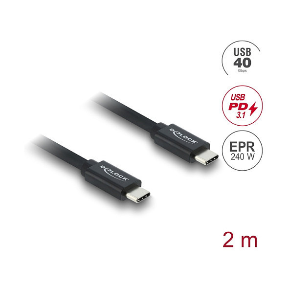 "DeLOCK Coaxial USB 40 Gbps cable USB PD 3.1 240 W 2 m. Cable length: 2 m. Connector 1: USB C, Connector 2: USB C, USB version: USB4 Gen 3x2, Maximum data transfer rate: 40 Gbit/s, Connector contacts plating: Gold, Product colour: Black"\n"This USB cable by Delock enables the connection of various devices, such as smart phones, monitors, external enclosures and docking stations, via a USB Type-C™ or Thunderbolt™ 3 port of a PC or laptop. The cable supports the transfer of USB as well as DisplayPort and PCI Express data.