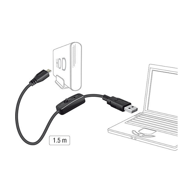 "DeLOCK 84803. Cable length: 1.5 m. Connector 1: USB A, Connector 2: Micro-USB B, USB version: USB 2.0, Product colour: Black"\n"This Delock USB charging cable can connect to a free standard USB A interface. By using the on / off switch the power supply for the connected device can switched on or off. Therefor it is not needed to remove the cable from the female port to switch off the power supply."