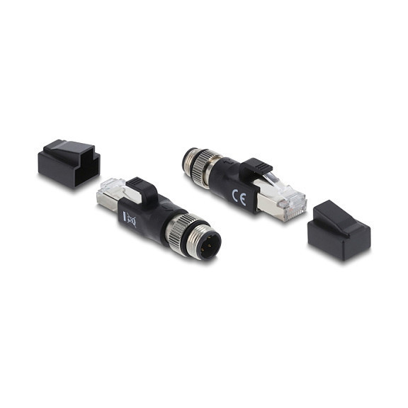 "DeLOCK M12 Adapter D-coded 4 pin male to RJ45 plug black. Connector 1: M12 4-pin, Connector 2: RJ-45, Connector contacts plating: Gold. Product colour: Black"\n"This industrial Ethernet adapter by Delock can be used to connect various components with M12 connectors, e.g. for industrial cameras, industrial Ethernet, or fieldbus systems."