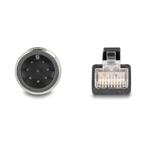 "DeLOCK M12 Cable A-coded 8 pin male to RJ45 male PVC 1 m. Cable length: 1 m, Cable standard: Cat5e, Cable shielding: S/FTP (S-STP), Connector 1: M12, Connector 2: RJ-45, Product colour: Black"\n"This industrial Ethernet cable by Delock can be used to connect various components with M12 connectors, e.g. for machine control or automation.
