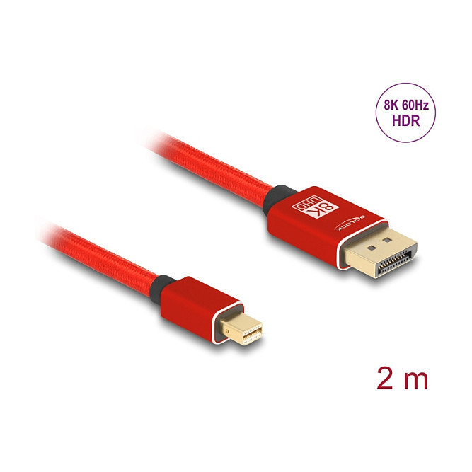 "DeLOCK Mini DisplayPort to DisplayPort cable 8K 60 Hz 2 m red metal without latch. Cable length: 2 m, Connector 1: Mini DisplayPort, Connector 2: DisplayPort. Cable diameter: 6 mm. Package type: Hanging box. Country of origin: China"\n"This DisplayPort cable by Delock is used to connect devices with a DisplayPort interface, such as monitors, projectors or televisions, to a PC or laptop with a mini DisplayPort interface.