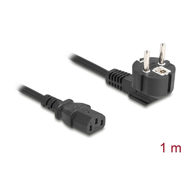 "DeLOCK PC power cord earthed plug CEE 7/7 90° angled to C13 female, 1 m, 3 x 1.00 mm² black. Cable length: 1 m, Connector 1: Power plug type E+F, Connector 2: IEC C13, Cable type: H05VV-F. Input voltage: 250 V"\n"This AC power cord by Delock with earthed plug to C13 female is the ideal choice for a reliable power supply for your devices. Whether as PC power supply cord, monitor power cable or power cable for servers, this power cable C13 convinces with safety, robustness and versatility.