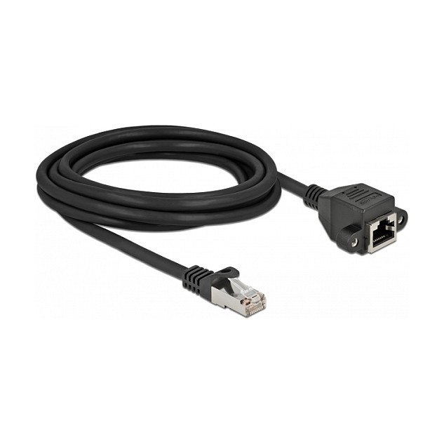 "DeLOCK Network Extension Cable S/FTP RJ45 plug to RJ45 jack Cat.6A 3 m black. Cable length: 3 m, Cable standard: Cat6a, Cable shielding: S/FTP (S-STP), Connector 1: RJ-45, Connector 2: RJ-45, Product colour: Black"\n"This network cable by Delock can be used to extend and connect various devices. The screwable RJ45 jack can be attached, for e.g., to a slot bracket or a housing with a suitable cut-out."