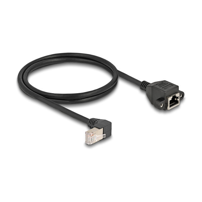 "DeLOCK Network Extension Cable S/FTP RJ45 plug 90° angled to RJ45 built-in jack Cat.6A 1 m black. Cable length: 1 m, Cable standard: Cat6a, Cable shielding: S/FTP (S-STP), Connector 1: RJ-45, Connector 2: RJ-45, Product colour: Black"\n"This network cable by Delock can be used to extend and connect various devices. The screwable RJ45 jack can be attached, for e.g., to a slot bracket or a housing with a suitable cut-out.