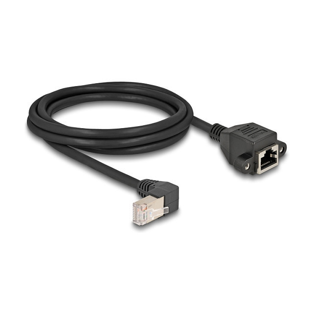 "DeLOCK Network Extension Cable S/FTP RJ45 plug 90° angled to RJ45 built-in jack Cat.6A 2 m black. Cable length: 2 m, Cable standard: Cat6a, Cable shielding: S/FTP (S-STP), Connector 1: RJ-45, Connector 2: RJ-45, Product colour: Black"\n"This network cable by Delock can be used to extend and connect various devices. The screwable RJ45 jack can be attached, for e.g., to a slot bracket or a housing with a suitable cut-out.