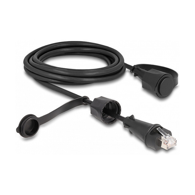 "DeLOCK Network Cable RJ45 plug to RJ45 plug Cat.6 STP with protective cap outdoor IP68 dust- and waterproof black 3 m. Cable length: 3 m, Cable standard: Cat6, Cable shielding: S/UTP (STP), Connector 1: RJ-45, Connector 2: RJ-45, Product colour: Black"\n"Description