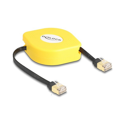 "DeLOCK RJ45 Retractable Cable Cat.6A STP 1.5 m black / yellow. Cable length: 1.5 m, Cable standard: Cat6a, Cable shielding: S/UTP (STP), Connector 1: RJ-45, Connector 2: RJ-45, Product colour: Black, Yellow"\n"This RJ45 retractable cable by Delock can be used to connect various network devices.