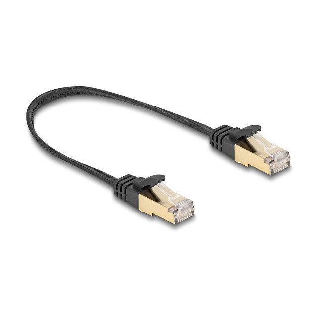 "DeLOCK RJ45 Flat Network Cable with braided jacket Cat.6A U/FTP plug to plug 0.25 m black. Cable length: 0.25 m, Cable standard: Cat6a, Cable shielding: S/FTP (S-STP), Connector 1: RJ-45, Connector 2: RJ-45, Product colour: Black"\n"This network cable by Delock can be used to connect different networking devices, e.g. a NIC to a switch or a patch panel.