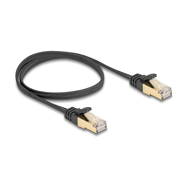 "DeLOCK RJ45 Flat Network Cable with braided jacket Cat.6A U/FTP plug to plug 0.5 m black. Cable length: 0.5 m, Cable standard: Cat6a, Cable shielding: S/FTP (S-STP), Connector 1: RJ-45, Connector 2: RJ-45, Product colour: Black"\n"This network cable by Delock can be used to connect different networking devices, e.g. a NIC to a switch or a patch panel.