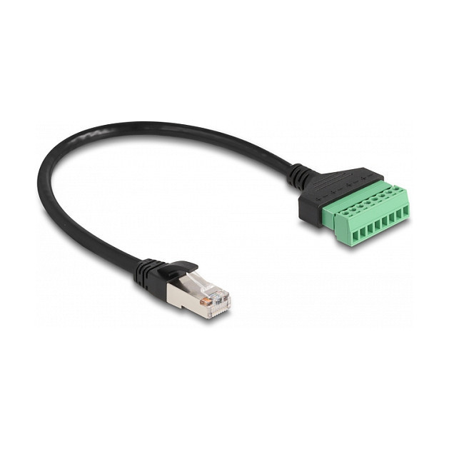 "DeLOCK RJ45 Cable Cat.6 plug to Terminal Block Adapter 30 cm 2-part. Cable length: 0.3 m, Cable standard: Cat6, Cable shielding: U/UTP (UTP), Connector 1: RJ-45, Product colour: Black, Green"\n"This cable by Delock can be used to extend and connect various network devices. Strands with stripped ends can be connected via the terminal block."