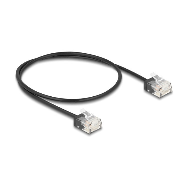 "DeLOCK RJ45 Network Cable Cat.6 UTP Ultra Slim 0.5 m black with short plugs. Cable length: 0.5 m, Cable standard: Cat6, Cable shielding: U/UTP (UTP), Connector 1: RJ-45, Connector 2: RJ-45, Connector contacts plating: Gold, Data transfer rate: 1000 Mbit/s, Product colour: Black"\n"This network cable by Delock can be used to connect different networking devices, e.g. a NIC to a switch or a patch panel.