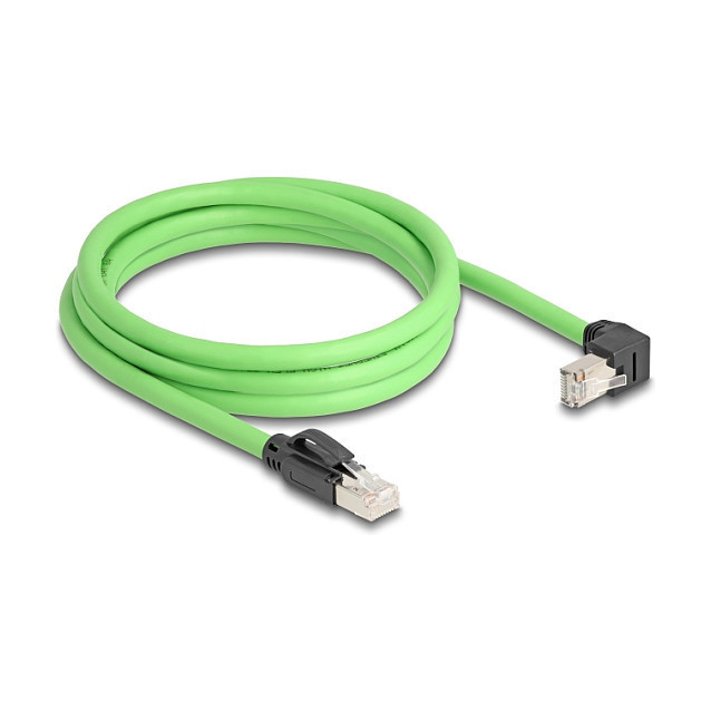 "DeLOCK RJ45 Network Cable Cat.6A plug to plug downwards angled SF/UTP suitable for drag chains PUR (TPU) 2 m green. Cable length: 2 m, Cable standard: Cat6a, Cable shielding: SF/UTP (S-FTP), Connector 1: RJ-45, Connector 2: RJ-45, Product colour: Green"\n"Description