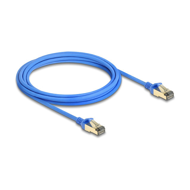 "DeLOCK RJ45 Network Cable Cat.8.1 F/FTP Slim 3 m blue. Cable length: 3 m, Cable standard: Cat8.1, Cable shielding: F/FTP (FFTP), Connector 1: RJ-45, Connector 2: RJ-45, Data transfer rate: 40000 Mbit/s, Product colour: Blue"\n"This network cable by Delock can be used to connect various devices and is suitable for 40GBASE-T Ethernet applications with a frequency of 2 GHz and a data transfer rate of up to 40 Gbps.