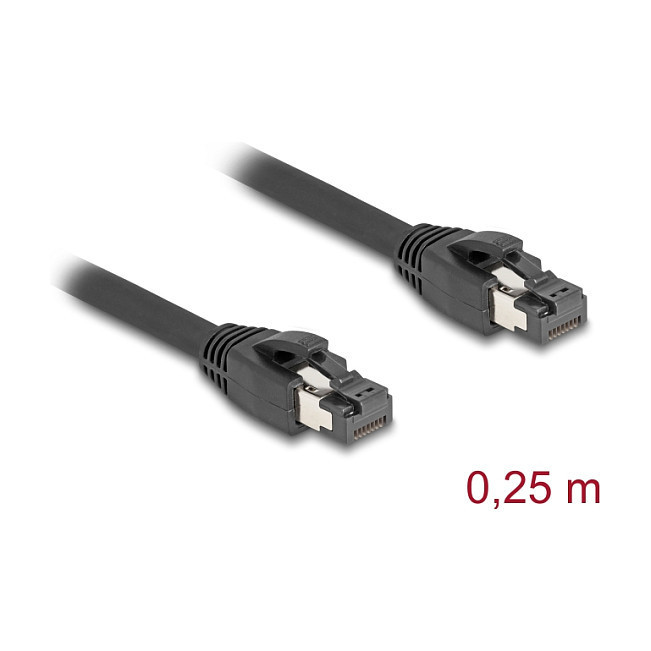 "DeLOCK RJ45 Network Cable Cat.8.1 S/FTP 25 cm up to 40 Gbps black. Cable length: 0.25 m, Cable standard: Cat8.1, Cable shielding: S/FTP (S-STP), Connector 1: RJ-45, Connector 2: RJ-45, Data transfer rate: 40000 Mbit/s, Product colour: Black"\n"This GHMT certified network cable by Delock can be used to connect various devices and is suitable for 40GBASE-T Ethernet applications with a frequency of 2 GHz and a data transfer rate of up to 40 Gbps."