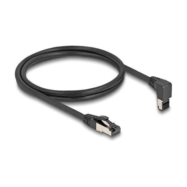 "DeLOCK RJ45 Network Cable Cat.8.1 S/FTP 90° downwards angled / straight 2 m black. Cable length: 2 m, Cable standard: Cat8.1, Cable shielding: S/FTP (S-STP), Connector 1: RJ-45, Connector 2: RJ-45, Data transfer rate: 40000 Mbit/s, Product colour: Black"\n"Description