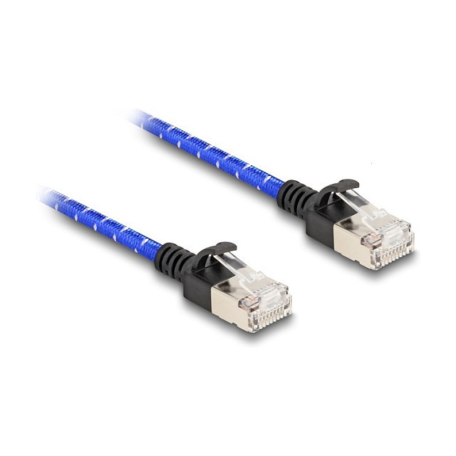 "DeLOCK RJ45 Network Cable with braided coating Cat.6A U/FTP Slim 1 m blue. Cable length: 1 m, Cable standard: Cat6a, Cable shielding: U/FTP (STP), Connector 1: RJ-45, Connector 2: RJ-45, Connector contacts plating: Gold, Data transfer rate: 10000 Mbit/s, Product colour: Blue"\n"Description