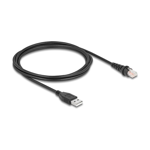 "DeLOCK RJ50 to USB 2.0 Type-A Barcode Scanner Cable 2 m. Cable length: 2 m, Connector 1: RJ-45, Connector 2: USB Type-A. Cable diameter: 4.2 mm. Package type: Polybag"\n"Description