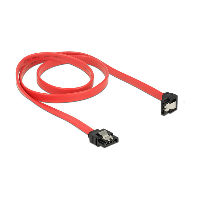 "DeLOCK 83980. Cable length: 0.7 m, Connector 1: SATA 7-pin, Connector 2: SATA 7-pin. Package type: Polybag"\n"This SATA cable by Delock enables the internal connection of various SATA devices, e.g. HDDs, controller cards or Flash memories. It complies with the latest standard and provides a data transfer rate of up to 6 Gb/s. It is downwards compatible to the previous SATA versions, but can then only reach the respective transfer speed. When connecting this cable to a HDD the cable will be lead downwards. The metal clips on the connectors ensure that the cable reliably clicks into place."