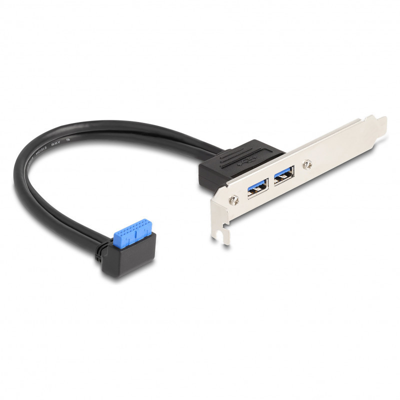 "DeLOCK Slot bracket 1 x USB 5 Gbps pin header female 90° angled to 2 x USB 5 Gbps Type-A female 50 cm. Host interface: USB 3.0 internal (19-pin), Output interface: USB 3.2 Gen 1 (3.1 Gen 1), Host interface gender: Female. Product colour: Black, Country of origin: China. Data transfer rate (max): 5 Gbit/s"\n"This slot bracket by Delock expands the PC by two USB 5 Gbps Type-A female ports. The cable of the slot bracket can be connected internally to the motherboard with a 19 pin USB 5 Gbps pin header male. Thus, the internal connection will be lead outside, in order to connect devices with USB Type-A connector to the computer."