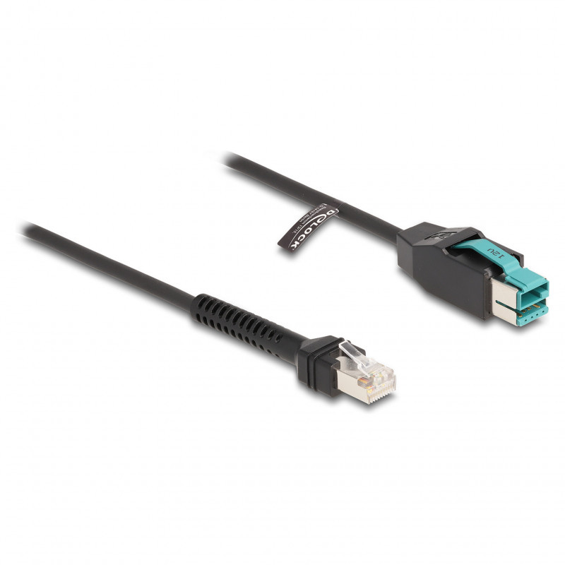 "DeLOCK Coiled Cable RJ50 male to PoweredUSB male 12 V 3 m black. Connector 1: RJ-45, Connector 2: USB 2.0 Type-A, Cable length: 3 m. Product colour: Black"\n"This RJ50 coiled cable by Delock can be used to connect various control and measuring devices. The PoweredUSB connector is used both for data transmission and for power supply of the connected device.