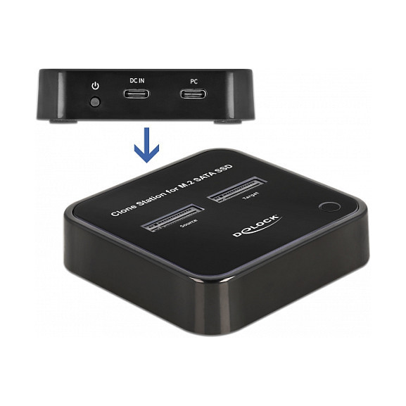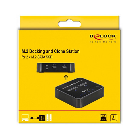 "DeLOCK M.2 Docking Station for 2 x M.2 SATA SSD with Clone function. Storage media type: SSD, Storage drive interface: M.2, Storage drive sizes supported: M.2. Host interface: USB 3.2 Gen 2 (3.1 Gen 2) Type-C. Product colour: Black, Maximum data transfer rate: 6 Gbit/s. Windows operating systems supported: Windows 10, Windows 10 x64, Windows 11, Windows 8.1, Windows 8.1 x64. Width: 79 mm, Depth: 72 mm, Height: 18 mm"\n"This M.2 docking station by Delock enables the installation of two M.2 SATA SSDs and it can be connected via USB to the PC or laptop. The included USB cable allows the connection to a free USB-C™ port.