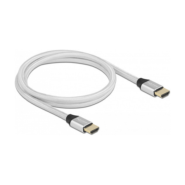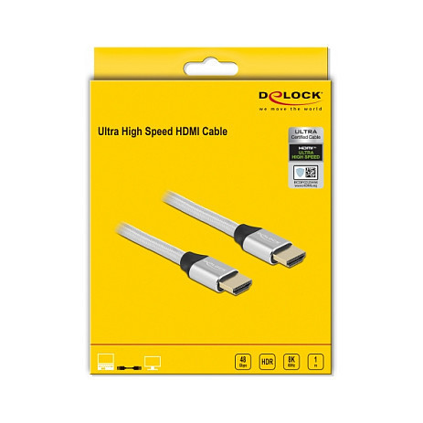 "DeLOCK Ultra High Speed HDMI Cable 48 Gbps 8K 60 Hz silver 1 m certified. Cable length: 1 m, Connector 1: HDMI Type A (Standard), Connector 1 gender: Male, Connector 2: HDMI Type A (Standard), Connector 2 gender: Male, Connector contacts plating: Gold, 3D, Data transfer rate: 48 Gbit/s, Audio Return Channel (ARC), Product colour: Silver"\n"Description