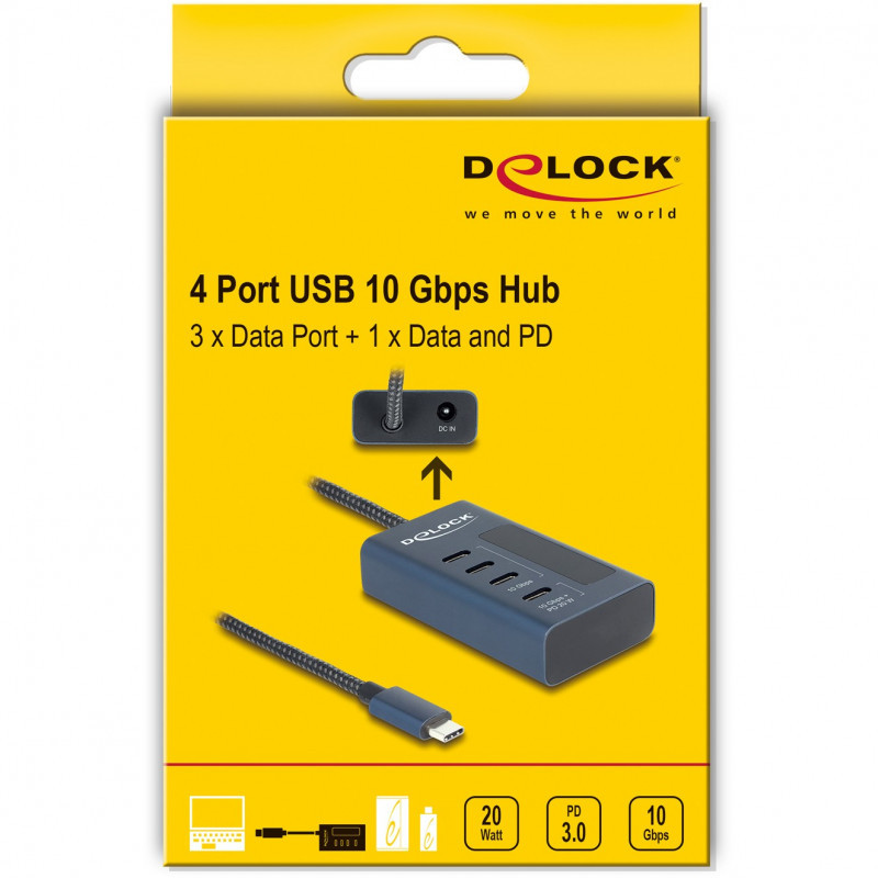 USB Šakotuvai | DELOCK USB 10 Gbps Hub mit 4 USB Type-C Ports davon 3 x Datenport + 1 x Daten und PD 20 Watt mit Leistungsanzeige