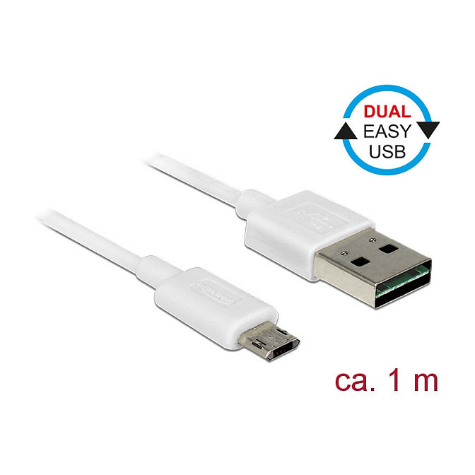 "DeLOCK EASY-USB 2.0 Cable Type-A male to EASY-USB Type Micro-B male angled left / right 2 m black. Cable length: 2 m. Connector 1: USB A, Connector 2: Micro-USB B, USB version: USB 2.0, Product colour: Black"\n"This cable by Delock with EASY-USB Type-A male and EASY-USB Type Micro-B male can be plugged into the appropriated USB female port in both directions. Thus the male connector can be used both-sided which makes the plug in easier."