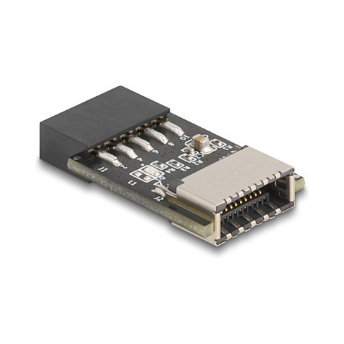 "DeLOCK Nicht kategorisiert. Host interface: USB Type-C, Output interface: USB Type-E, Host interface gender: Female. Product colour: Grey, Country of origin: China. Data transfer rate (max): 480000 Gbit/s. Width: 20.6 mm, Depth: 29.5 mm, Height: 5.45 mm. Quantity per pack: 1 pc(s), Package type: Polybag"\n"This adapter by Delock converts the internal USB pin header male into the internal USB type-E key A female. Various cables can be connected to the adapter, to provide either one USB Type-C™ or one USB Type-A interface."