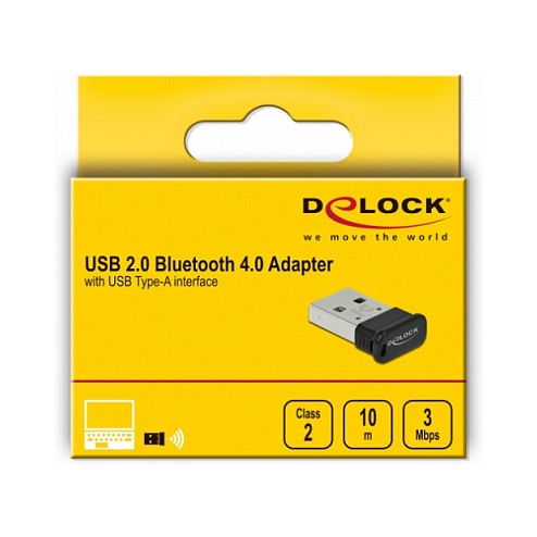 "DeLOCK USB 2.0 Bluetooth 4.0 Adapter USB Type-A. Wireless technology: Bluetooth, Host interface: USB, Bluetooth profiles: A2DP. Windows operating systems supported: Windows 10, Windows 8.1. Width: 15 mm, Depth: 22.3 mm, Height: 7.4 mm. Quantity per pack: 1 pc(s)"\n"This USB 2.0 Bluetooth adapter by Delock enables a