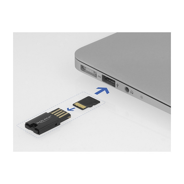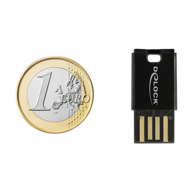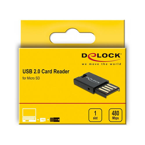 "DeLOCK USB 2.0 Card Reader for Micro SD memory cards. Compatible memory cards: MicroSD (TransFlash), MicroSDHC, MicroSDXC, Product colour: Black, Data transfer rate: 480 Mbit/s. Interface: USB 2.0. Width: 13 mm, Depth: 28 mm, Height: 4 mm. Quantity per pack: 1 pc(s), Package type: Box"\n"The card reader by Delock can be used for reading and writing Micro SD memory cards. The card reader can be connected to a PC or laptop via the USB Type-A interface. The memory card will be plugged into the USB Type-A connector of the card reader."