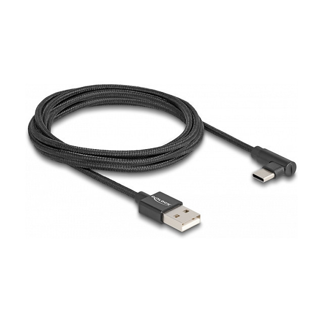 "DeLOCK USB 2.0 Cable Type-A male to USB Type-C male angled 2 m black. Cable length: 2 m. Connector 1: USB A, Connector 2: USB C, USB version: USB 2.0, Maximum data transfer rate: 0.48 Gbit/s, Product colour: Black"\n"This USB cable by Delock enables the connection between a device with a USB Type-C™ connector and a PC or a laptop equipped with a free USB port. Optically it convinces with its fine textile shielding and with its connector in metal housing.