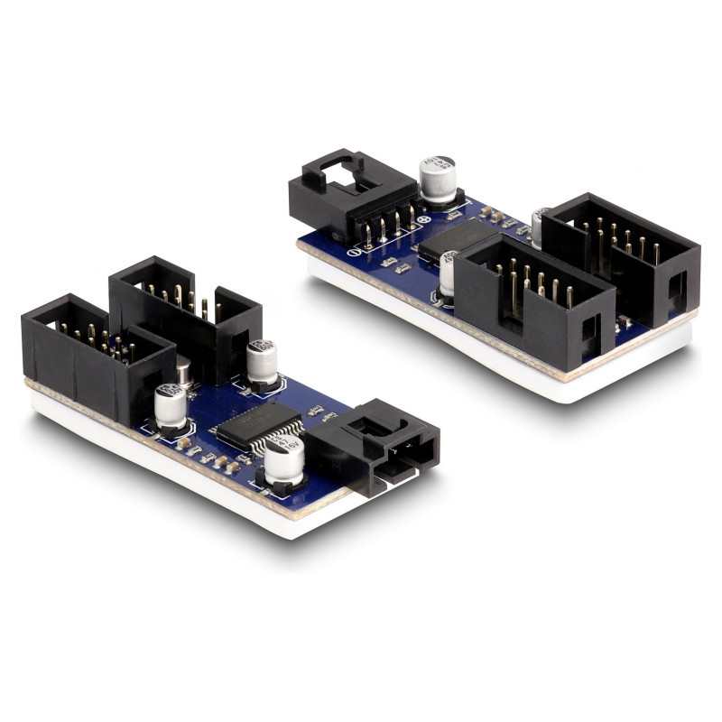 "DeLOCK USB 2.0 pin header male Hub 2 Port. Host interface: USB header - 4 pin, Output interface: USB 2.0 header - 9 pin, Host interface gender: Male. Product colour: Black, Blue, Purpose: PC, Country of origin: China. Data transfer rate (max): 0.48 Gbit/s. Windows operating systems supported: Windows 10, Windows 11, Windows 8.1, Linux operating systems supported: Linux Kernel 5.15, Server operating systems supported: Windows Server 2019. Width: 24 mm, Depth: 54 mm, Height: 14 mm"\n"This USB hub by Delock can be connected to an internal USB port and provides two 9 pin USB pin header male connectors. Using a USB pin header cable allows to connect up to 4 USB devices."