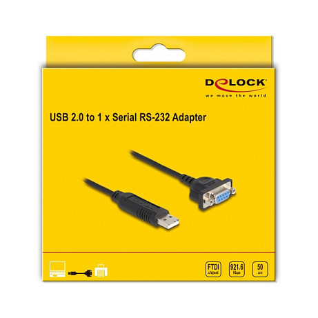 "DeLOCK USB 2.0 to serial RS-232 adapter with compact serial connector housing 50 cm FTDI. Product colour: Black, Cable length: 0.5 m, Connector 1: USB Type-A. Quantity per pack: 1 pc(s), Package type: Box"\n"Description