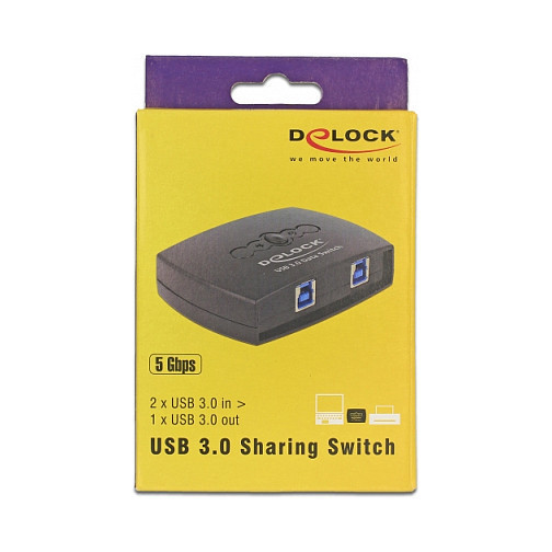 "DeLOCK 87723. Maximum data transfer rate: 5000 Gbit/s, Product colour: Black, Housing material: Plastic. Width: 69 mm, Depth: 95 mm, Height: 26 mm"\n"This sharing switch by Delock can be used on 2 computers to access a single USB device. For example, if a printer is connected, it can be selected by the button on the switch, which of the computers is connected to the printer. This connection can be switched at any time."