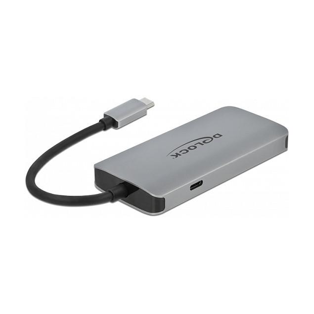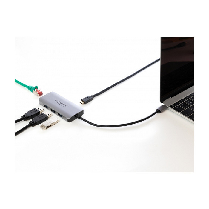 "DeLOCK USB 3.2 Gen 1 Hub with 4 Ports and Gigabit LAN and PD. Connectivity technology: Wired, Host interface: USB 3.2 Gen 1 (3.1 Gen 1) Type-C. Ethernet LAN data rates: 10,100,1000 Mbit/s, Copper ethernet cabling technology: 10BASE-T, 100BASE-TX, 1000BASE-T, Networking standards: IEEE 802.1Q, IEEE 802.1ab, IEEE 802.3, IEEE 802.3az, IEEE 802.3u, IEEE 802.3x. Product colour: Grey, Data transfer rate: 5 Gbit/s. Power source type: USB. Windows operating systems supported: Windows 10, Windows 8.1, Mac operating systems supported: Mac OS X 10.15.3 Catalina"\n"The USB hub by Delock is the mobile companion for laptops or tablets with USB Type-C™ connection. Up to three USB Type-A devices and one USB-C™ device can be connected to the hub.