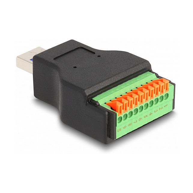 "DeLOCK USB 3.2 Gen 1 Type-A male to Terminal Block Adapter with push button. Connector 1: USB Type-A, Connector 2: 10 pin terminal block. Product colour: Black, Green"\n"This terminal block adapter by Delock can be used to connect bare wires without tools and can be connected to USB Type-A devices.