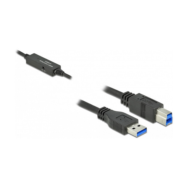 "DeLOCK 85379. Cable length: 5 m. Connector 1: USB A, Connector 2: USB B, USB version: USB 3.2 Gen 1 (3.1 Gen 1), Maximum data transfer rate: 5 Gbit/s, Product colour: Black"\n"This active USB cable by Delock with integrated signal amplifier is used to connect devices with USB Type-B female port to a PC or laptop with USB Type-A port.
